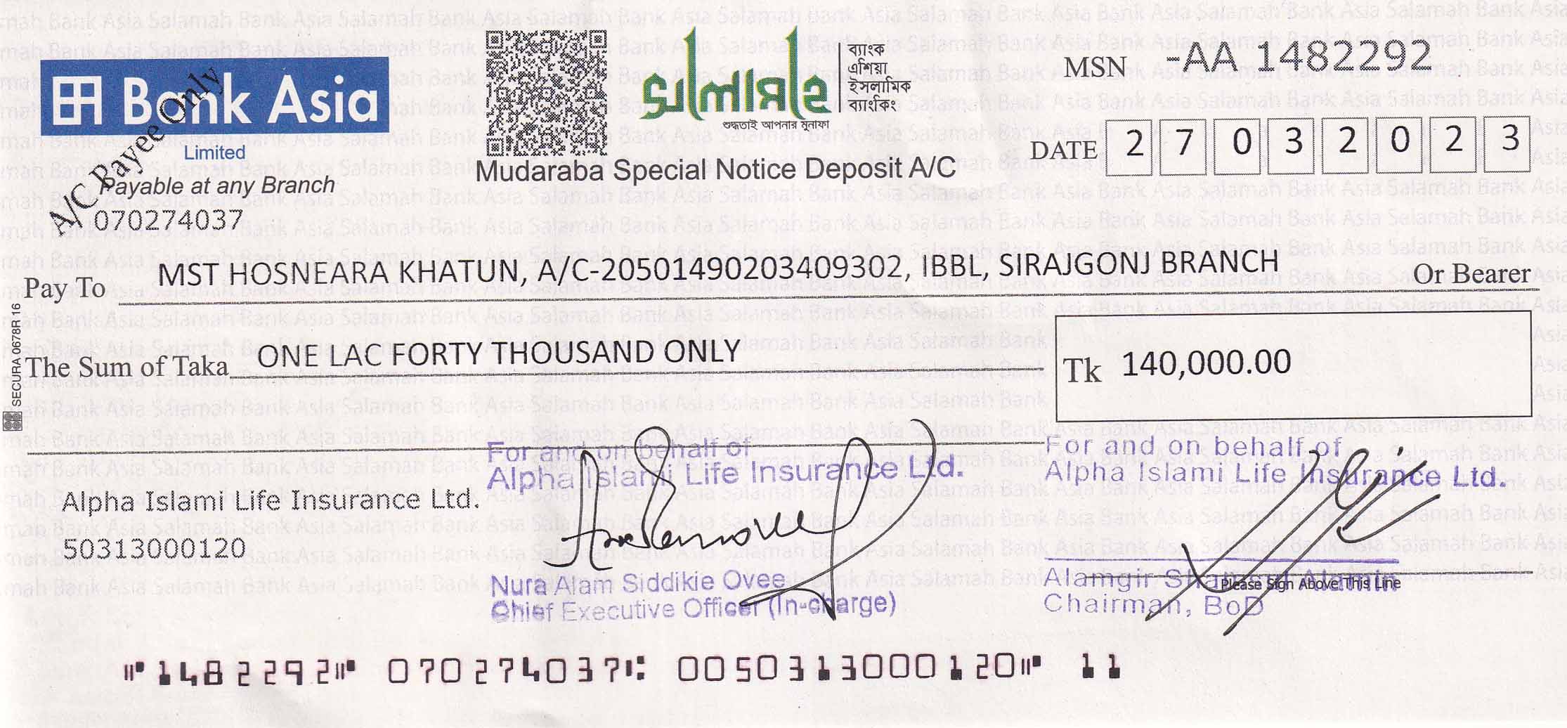 Claim Amount Tk. 1,40,000.00 has paid to Policy Holders Nominee Mst. Hosneara Khatun on 10-04-2023